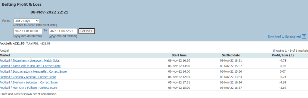 Here is my profit and loss for the weekend games, 5th-6th November: