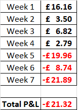 As you can see, the total loss for the weekend just gone was -£21.89. Not a good weekend at all. I’ll be looking at turning this around and trying to get some green in the last round of Premier League games before the break for the World Cup. Here’s how this impacts on the total profit and loss since I’ve started this trading journey: