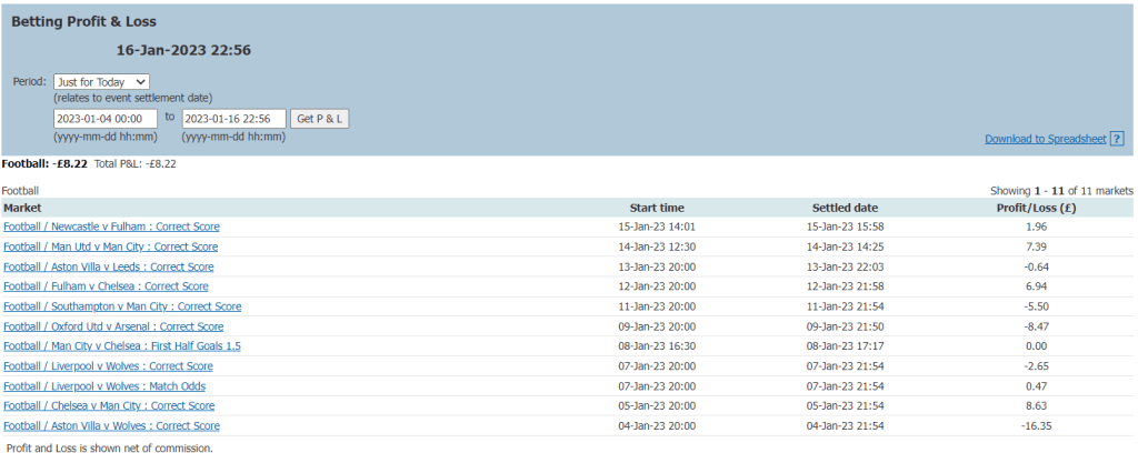 This is only going to be a quick post. I’ve been slowly getting back into the swing of things. I’ve still not been able to dedicate much time to trading the footy, but when I have I’ve tried to make the most of it. Here are my results from the 4th Jan through to the 16th Jan: