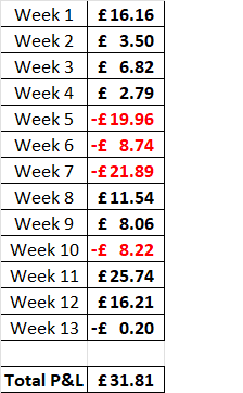Hello my church going brethren. Here’s the update on my results of my journey so far. For week 13 it was basically break even. I earned £9.80 and lost £10. A net loss of 20p! It was a step back, but only the smallest of steps back. Hardly noticeable in the grand scheme of things. So here is my P&L for week 13: