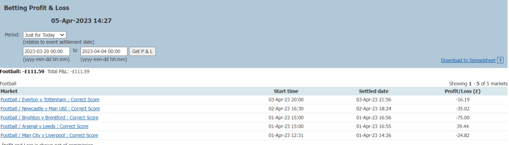I would like to point out, that if I did stay in my trades instead of trading out, then I would only have been £35 down for the week, as opposed to the £111 I was actually down. But, you could argue that I’m talking with the benefit of hindsight. Had those bets not gone my way I would have been a lot more than £111 down, I can assure you. For example, for the Everton vs Spurs game I had 1-1 as a CS selection, so I would have broke even if I just stayed in my trades. But the game was at 0-1 with 10 minutes to go. If the game stayed at 0-1, I would have been looking at a £48 loss. If it went to 1-1, I would have broke even. If it went to 0-2 I was looking at a £75 green. With Spurs looking very lacklustre (especially against 10 men), and Everton looking good but not too threatening (because they were a man down), I decided to take the loss. Was this the sensible thing to do? I’m thinking so, but a lot of you would argue not. I guess from a traders view, being able to take losses is paramount if you want to stay in the game. But, looking at the risk-to-reward ratio, you could argue that I had the opportunity of winning £75 (or breaking even) vs the risk of losing £48.