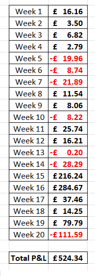 Well, what a kick in the old knackers Week 20 was! After the international break I was full of hope for a bumper weekend, but it wasn’t to be. As I mentioned in my previous post, Week 20 got off to a bad start, and it ended badly too. Although not too badly. I did have a feeling a losing week was around the corner, as I’d been on such a good run of greens of late, and this weekend it materialised. Hey-ho! We deal with it and move on.
