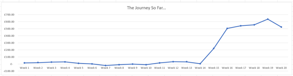 Here’s the table of my weekly profit and loss amounts, with a cumulative picture of my journey so far: