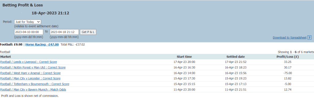 So, overall I managed to earn a £9.98 profit (ignore the horse racing, those were fun bets I placed for myself and my family on The Grand National). After losing £75 on one trade, I was quite pleased that I managed to turn the loss around into a green. From my suggestions on my Friday Night blog post, I decided to stay away from the Everton vs Fulham match as I didn’t feel confident in my predictions, and I’m glad I did as I would have seen a red for this game if I did trade it.