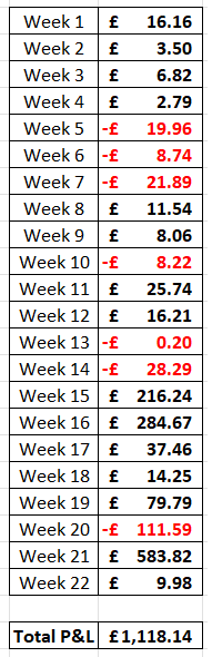 I’m happy to keep my head above the £1K profit mark, and I hope to keep it that way in the coming weeks. The biggest thing I’m taking away from this week, is despite taking a £75 loss, I still manged to keep on trading and post a profit at the end of the week.