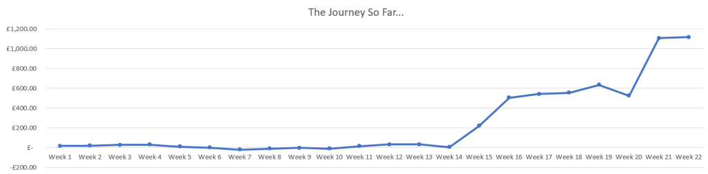 Here’s how Week 22 measures up to the previous weeks trading amounts, and also a cumulative picture of my journey so far: