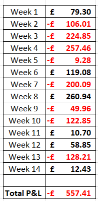 Hello peeps! Thought I’d give an update on how I’ve been doing. I’ve been quiet of late as the PL footy has been a bit quiet of late too. But, with it picking back up this week and there being a hell of a lot of football coming up in the recent weeks, I thought I’d get back to trading and get back to blogging. Over the last four trading weeks I’ve made a loss of around £46, which isn’t good. I was a bit flippant with the Bournemouth vs Liverpool game and instead of trading out I decided to see it out, much to my detriment. Anyway, here’s the breakdown of how those weeks went: