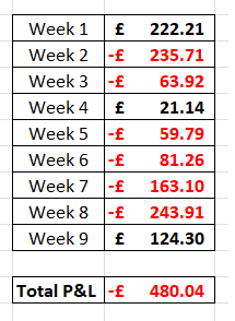 Well, it seems as though I might be back on track, not just with posting blogs but also with actually posting some profit!!! Yes, I actually managed to post a profit this week of £124. The thing is, this could have been a lot, lot more, but I’ll go into why this wasn’t to be the case later on in the blog. I’m not even 100% sure that the fix I put in for the issue I discovered last week was the main reason for the change in fortune, I just happened to have had a good week. So here a small snapshot of some of my results from week 9: