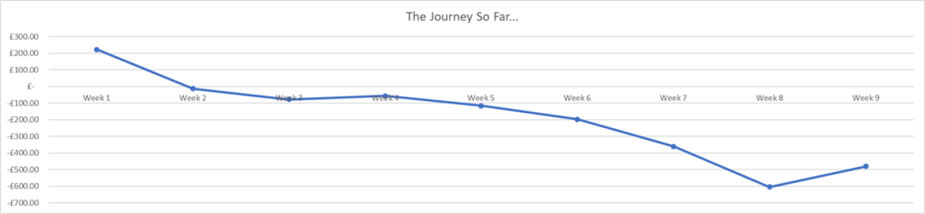 On Sunday I was at an event with a family member, so I didn’t have a massive amount of time to concentrate on the trading, so I only managed to stick a few trades on. I did take my laptop out with me, but I felt a tad rude getting it out in-front of everyone and ignoring them for a few minutes every half an hour. So when I looked back on the trades I missed out on, I was a tad frustrated that I did miss out on a fair bit of profit. Yes I would have had a few losers in amongst them, but overall I would have been up. Disappointing, and more’s the reason for me to invest some time and effort into learning about automating my trades so I don’t miss out on trading opportunities. Anyway, here’s how week 9’s profit compared to the previous weekly trades, and how it’s contributed to my journey so far: