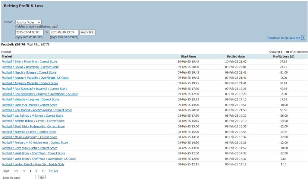 I’ve also noticed something very interesting with my selected trades. I typically select my correct scorelines and I usually see them out until the final whistle. On Saturday this resulted in losses. However, when I was checking these trades around the 60-70 minute mark, I’ve been seeing a alright-ish green for the majority of trades. Granted it’s not as much as what I could get if I was just to let them run, but it’s made me think about doubling my stake and then cashing out half of this stake when I am in a good green position, and letting the other half run until the end. Yes, this could mean there will be some games were I spectacularly crash and burn, but for the majority of trades I should be okay based off what I’ve been experiencing. I may keep an eye on this over the next 2 weeks and see if this is something worth pursuing.