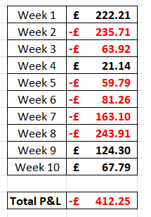 Anyway, here’s how the profit for Week 10 compares to the previous weeks P&L: