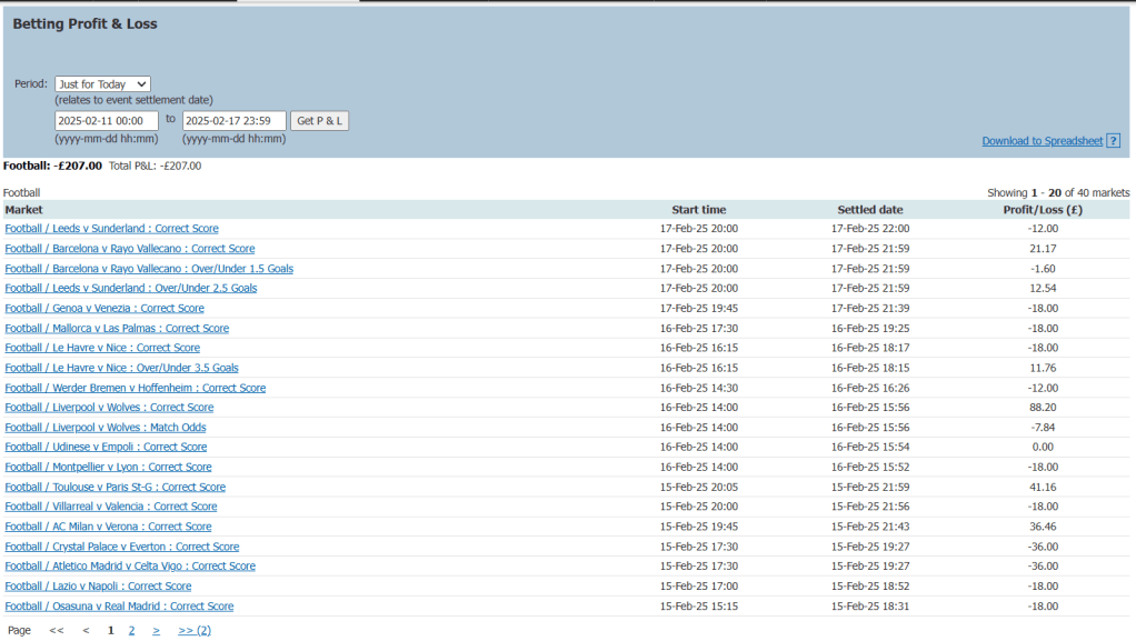 You’ll noticed I’m still covering some of my correct score predictions with trades on the overs market, so that if any late goals do come along I’m hopefully covered for them. You’ll notice I’ve done this for the Leeds match near the top of my screenshot. There were a couple of late goals which sank my correct score predictions, but that meant that my overs trades came in. This meant a small profit was made, instead of a £12 loss. So it’s thing like this which is helping me to become a bit more profitable. Or at least not lose as much. You will also notice that I covered my Liverpool vs Wolves correct score predictions, but this wasn’t necessary as they came in. This meant £7.84 was taken out of my overall profits. But overall this strategy has saved me more than cost me.