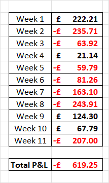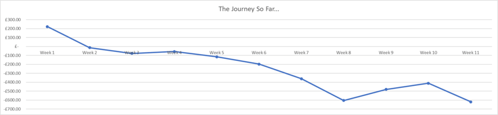 Here’s how week 11 measures up to my previous trading weeks profit and loss, and how it affects my trading journey: