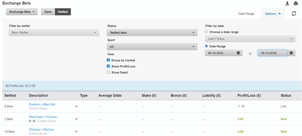 My trading profit and loss for today, 19th October ’22 Overall I was a little disappointed with my trade in terms of the money earned (£2.79). Especially when you consider how many games I traded and the amounts I’ve managed from previous trades. I think this is down to the fact that I dutched my bets rather than straight bet them. I think going forward I will be looking at doing straight bets rather than doing any dutching. I’ll see if this makes any difference to my bottom line.