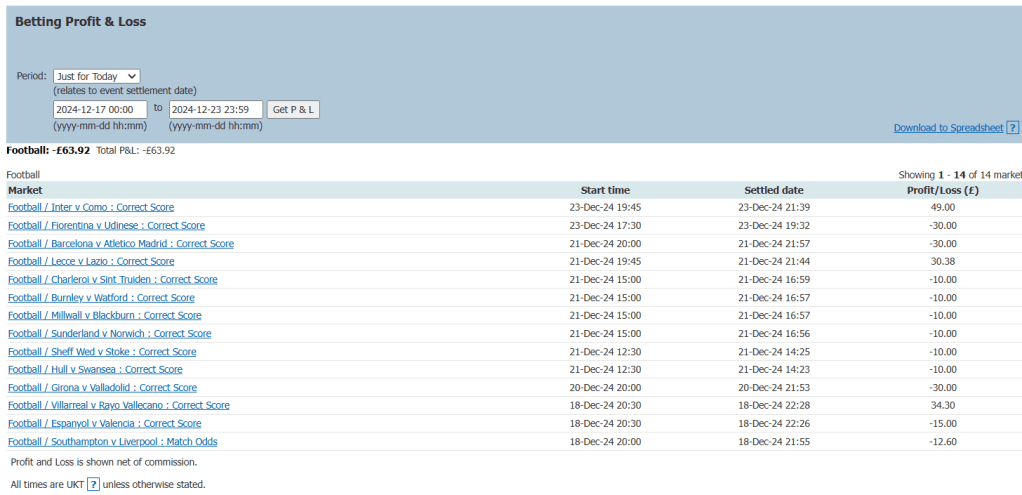 As you can see, that’s made a massive improvement to my current losing situation. I’m still at a loss, but there’s a small light at the end of the tunnel. I would love to go into the new year in profit, but I realise that this is a big ask. I say that, but there’s plenty of football over the festive period, so plenty of opportunities to make that possible. Anyway, here’s a visual update of my trading journey so far for this season: