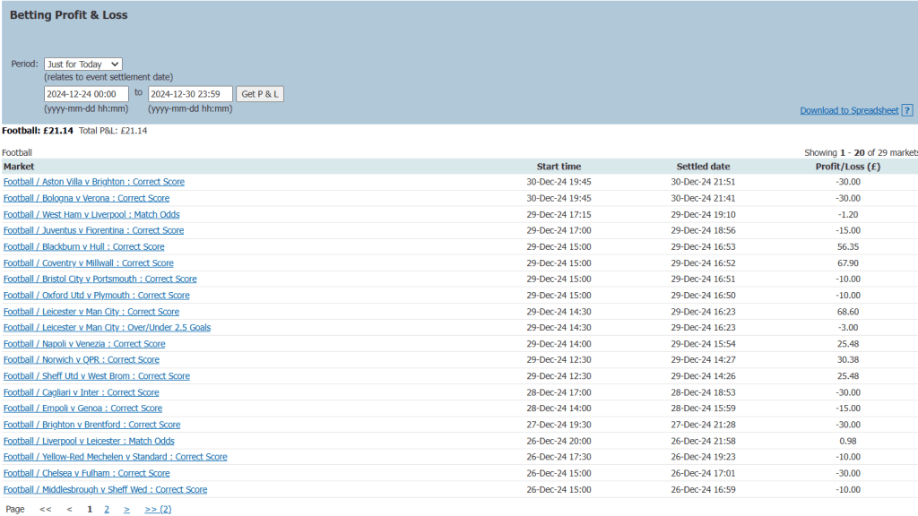 I’ve already placed my bets on today’s games, and I’ve targeted the Man City and Chelsea 3pm kick-offs. I’m keeping my eyes on these games as I’m typing this. What I will say, is that the odds on the correct scores for a City win weren’t that good, and thinking about it, I possibly should have avoided this game as there’s not a great deal of value in them. For the Chelsea game this was similar, and I possibly should have avoided this too. I was surprised Chelsea were such low odds actually, and a lay of Chelsea would have been the value bet.Looking at tonight’s game, Burnley vs Everton, I’d opt for the scorelines 0-2, 1-2, and 1-1. Not sure whether I’d bother with this game though as I’m out on a Chrimbo night out and won’t be able to concentrate on it.