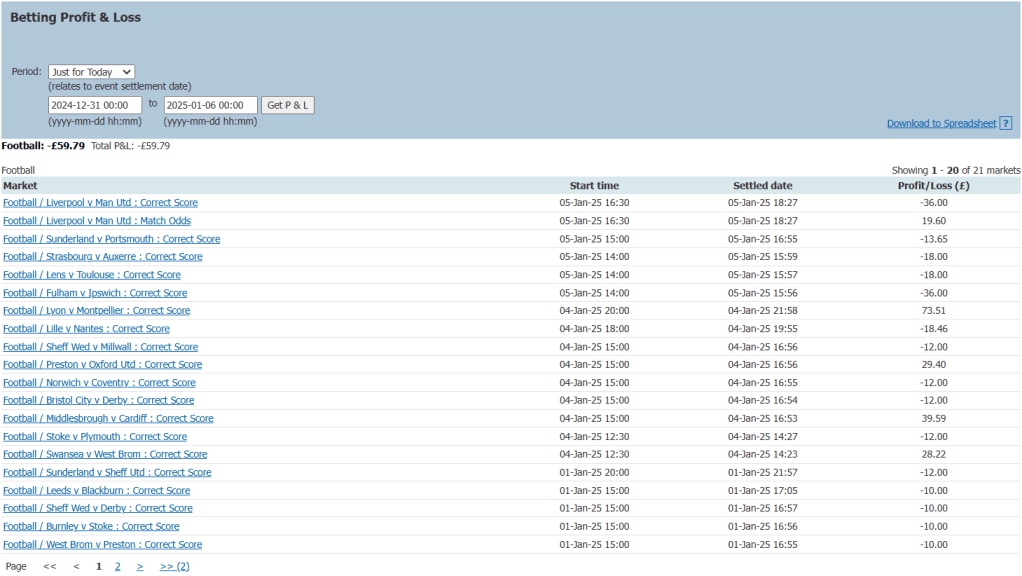 With the substantial losses for week 5, it has made me wonder if I’ve done my sums right, and I believe I have, but it may be something that I need to check before going into week 6. Some leagues kick back into action this weekend after having their Christmas break, so that’ll mean some additional opportunities to trade. Although saying that, the Premier League and Championship teams are involved in FA Cup games this weekend, which I don’t typically bother with, so there will be a bunch of games I’ll be unable to trade too.