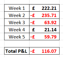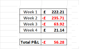 Well, after the previous week’s profit of £119, I was on a bit of a high and hoping to build upon that amount by publishing another good green figure. Unfortunately it wasn’t to be as you can see from the results below: