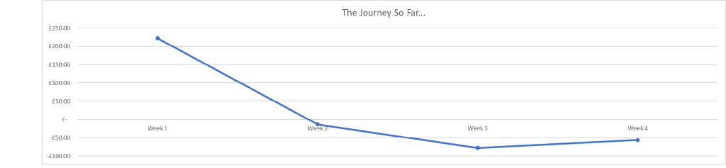 Anyway, back to the figures. Here’s the 4 weekly trading totals so far, and a ‘The journey So Far’ graph: